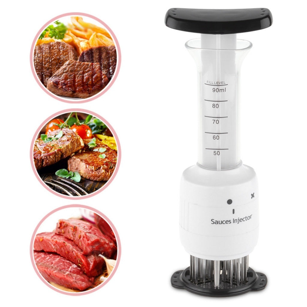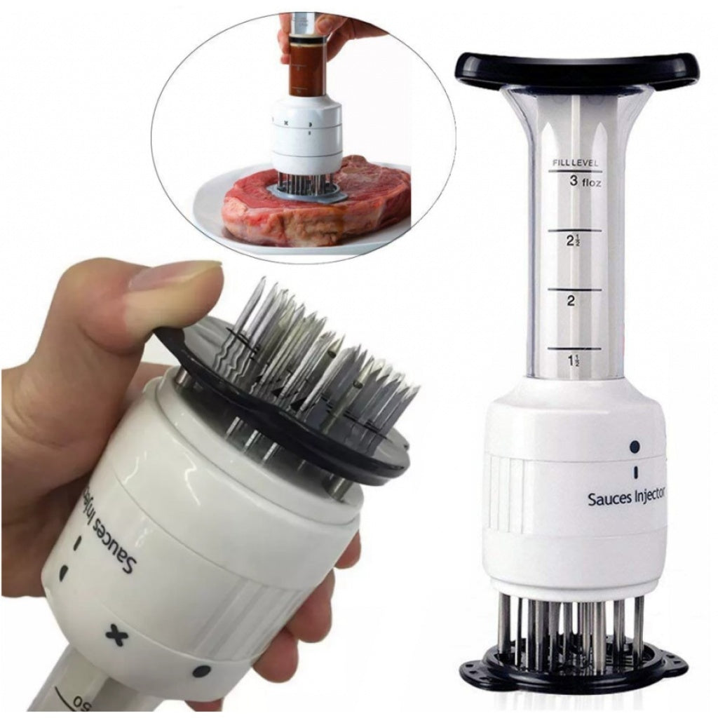 El inyector ergonómico permite una aplicación rápida y sencilla de marinados, transformando la textura y el sabor de tus platos sin esfuerzo.